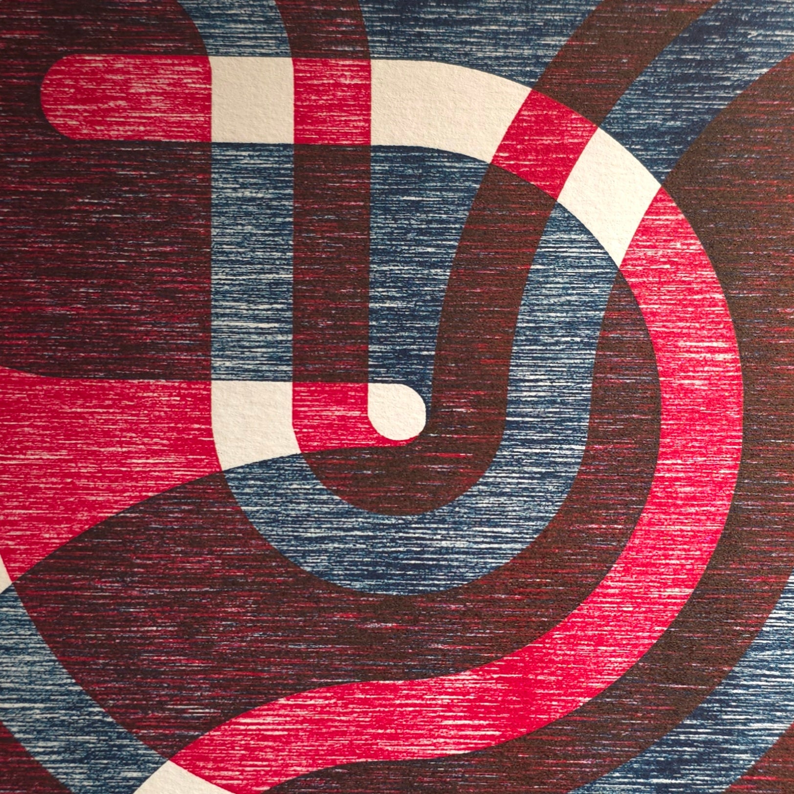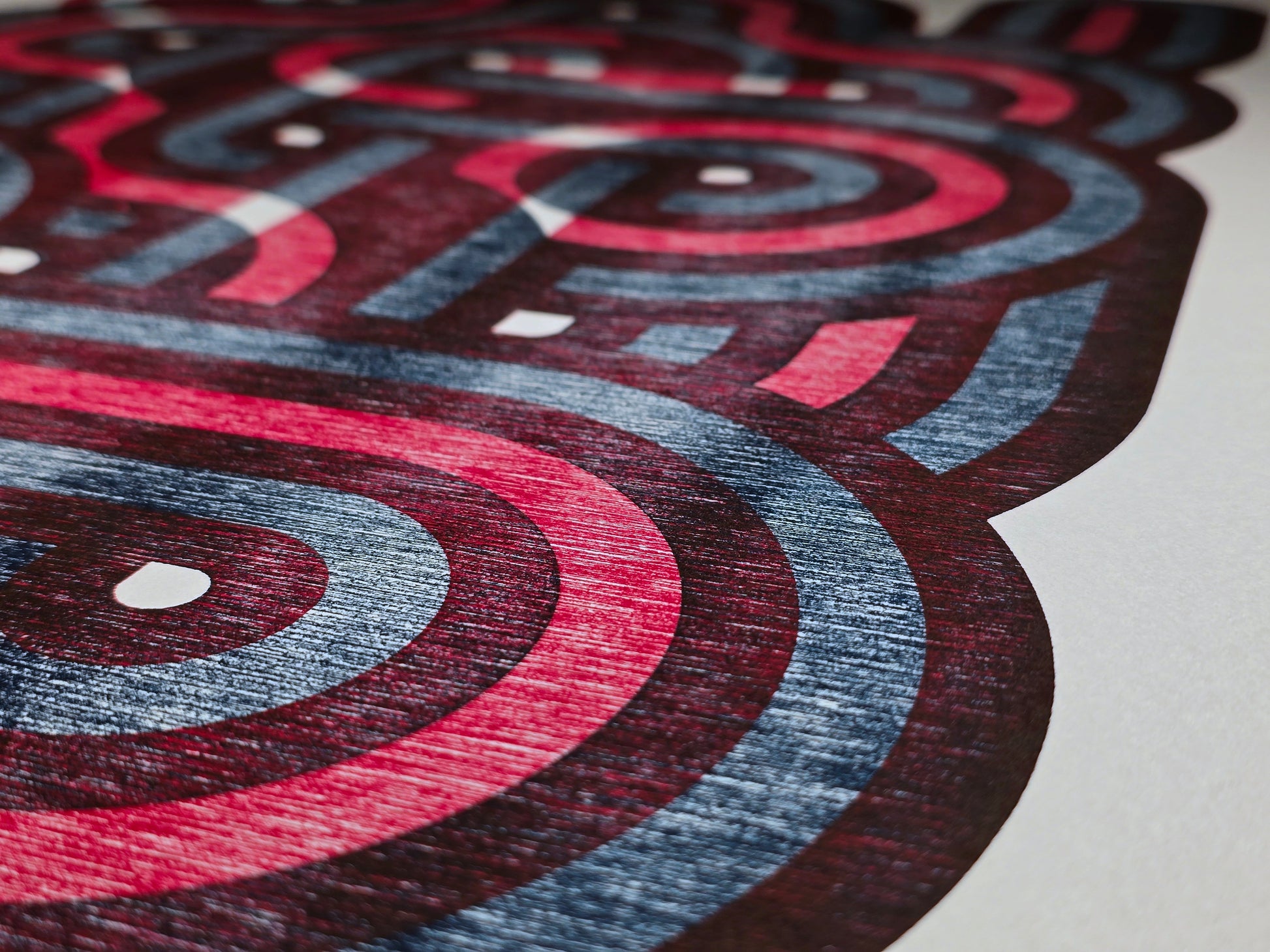 The composition is generated in JavaScript using Truchet tiles, engraved into birch plywood with a laser cutter, and printed by hand on a vintage Korrex proofing press.