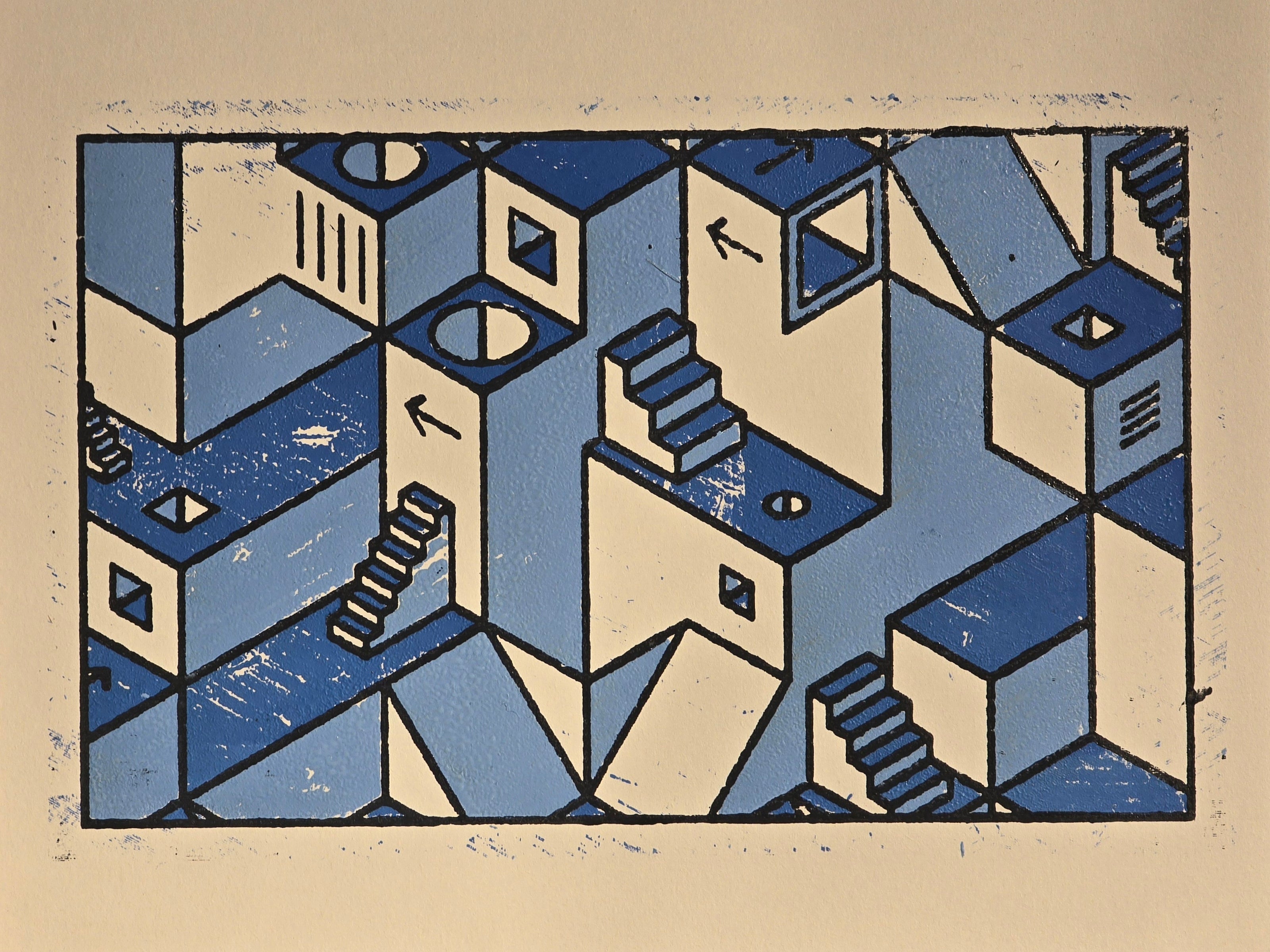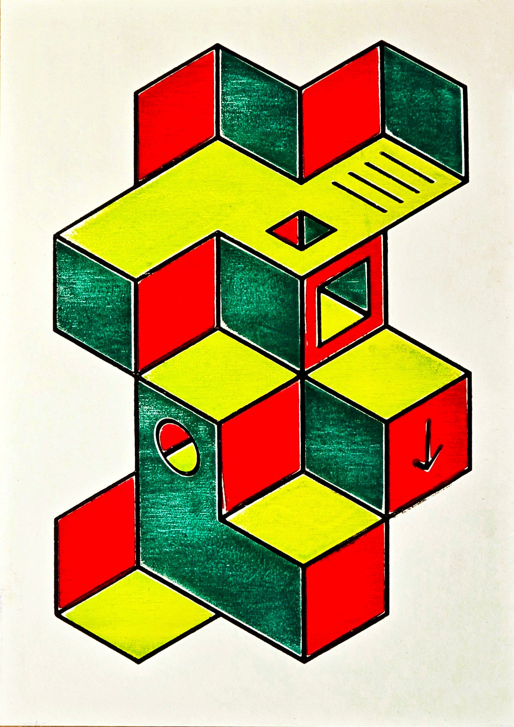This collection is built on that principle. Each work is a kind of constructed confusion: a pseudo-logical space that obeys its own internal rules. You’ll see blocks, stairs, structures that seem to make sense at first glance. Pointers that indicate direction. But look longer and the illusion starts to fall apart. The perspectives shift. The arrows go nowhere. The logic collapses in on itself.