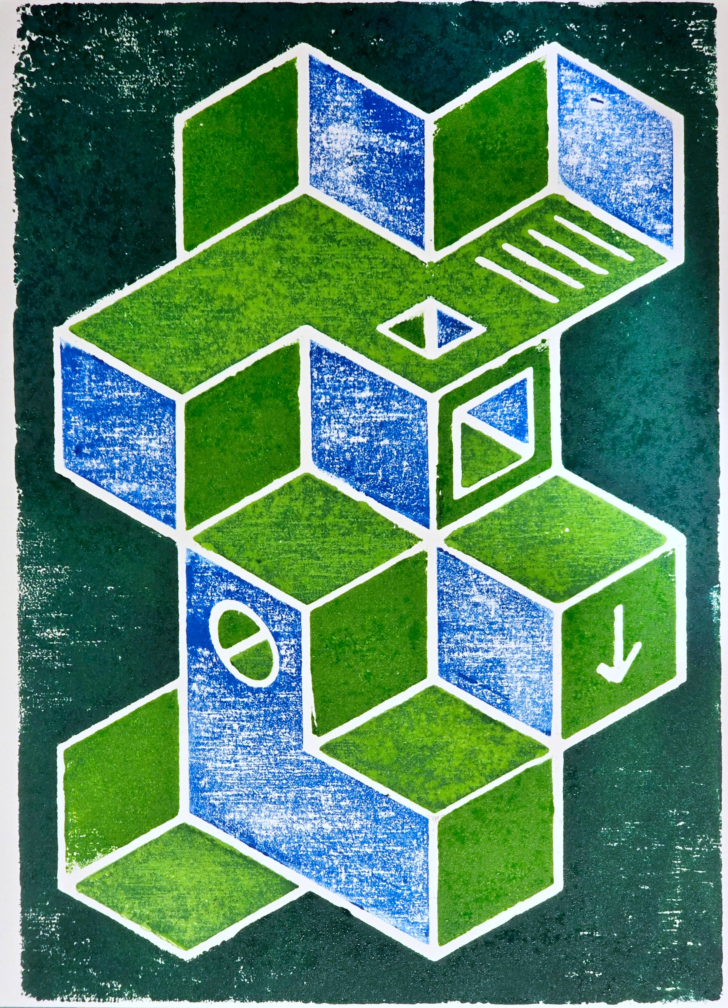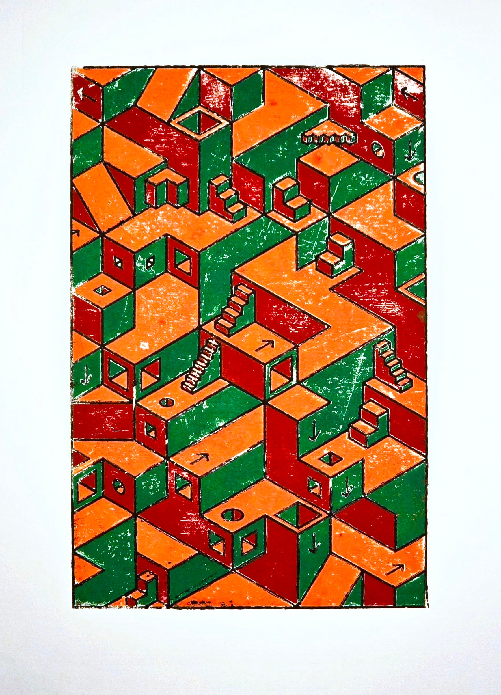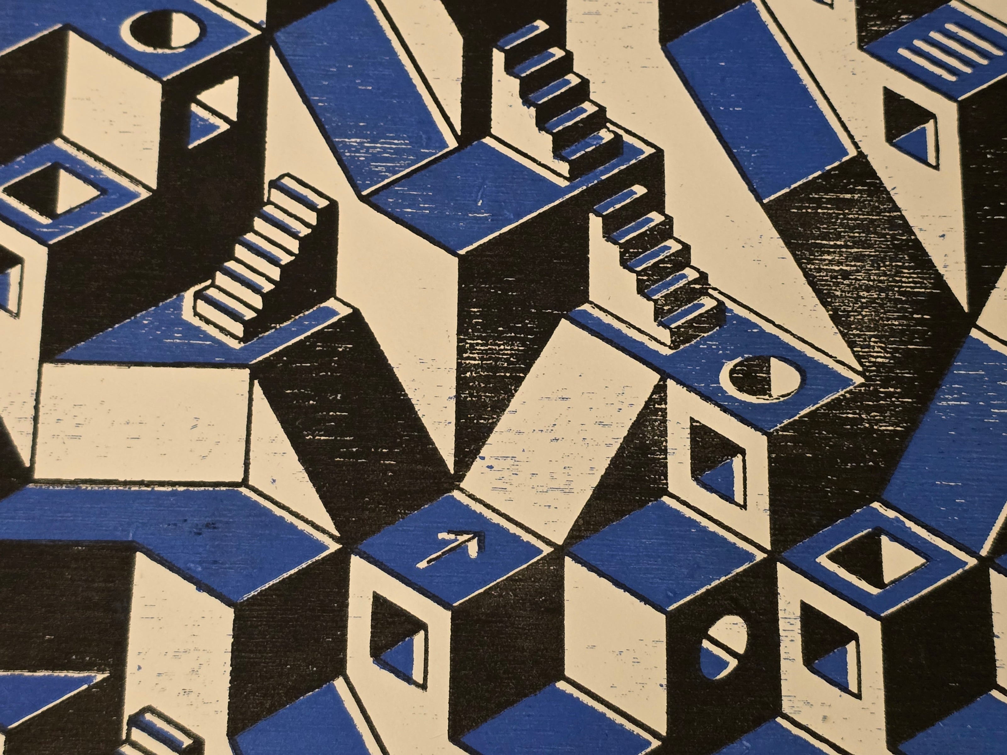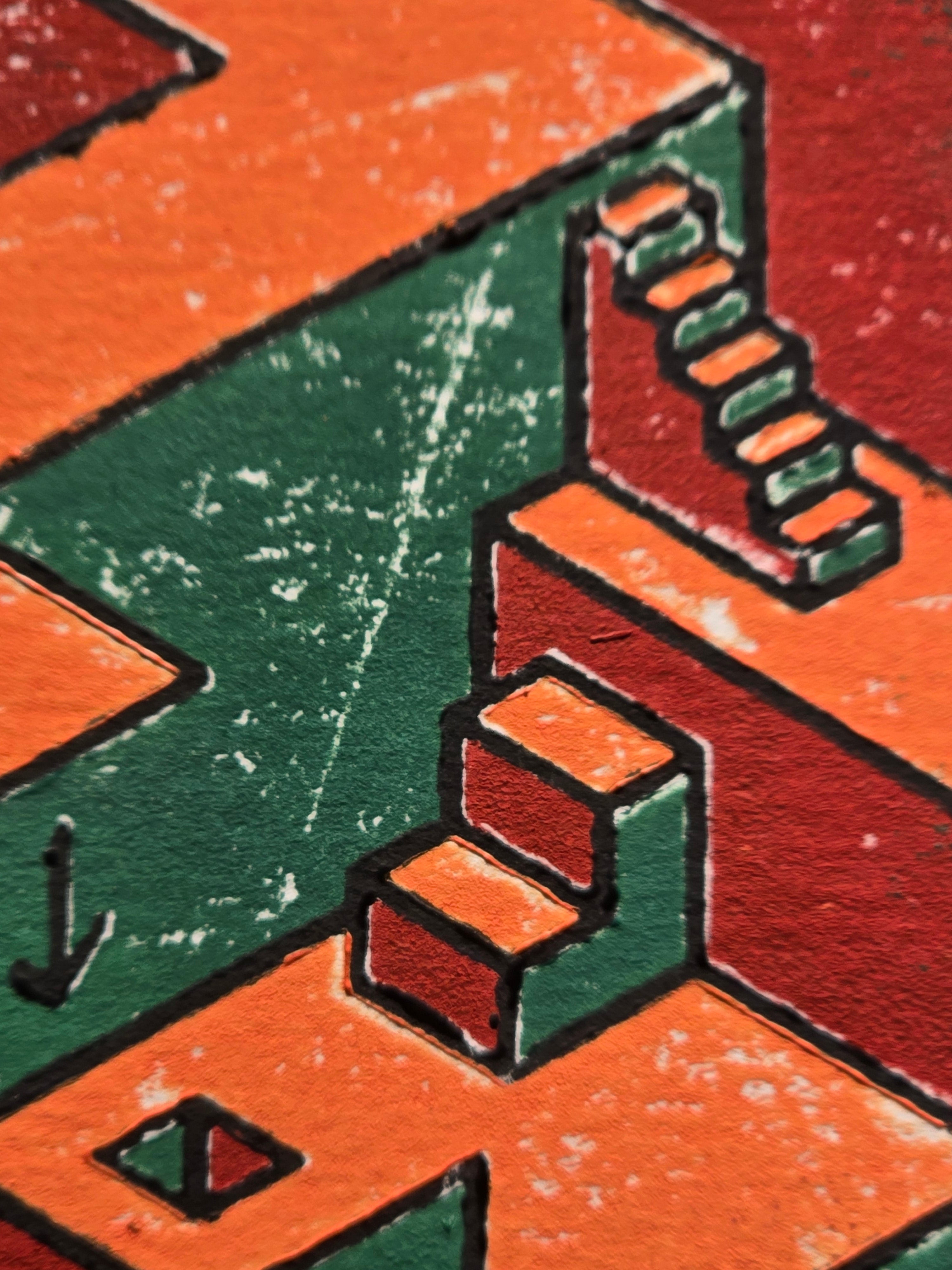 The wood relief is delicate, and over time it begins to show signs of wear. With each print, the surface may gather small imperfections—tiny scratches, worn areas, or missing fragments. Rather than distracting from the image, these artifacts become part of its character. They make the printed structures feel aged, weathered, like something that has endured. The print no longer suggests a perfect system, but something lived-in, vulnerable, and quietly breaking down.